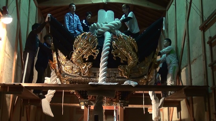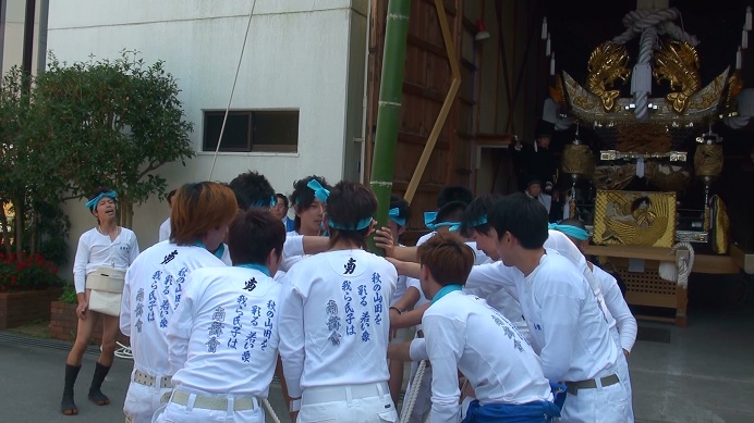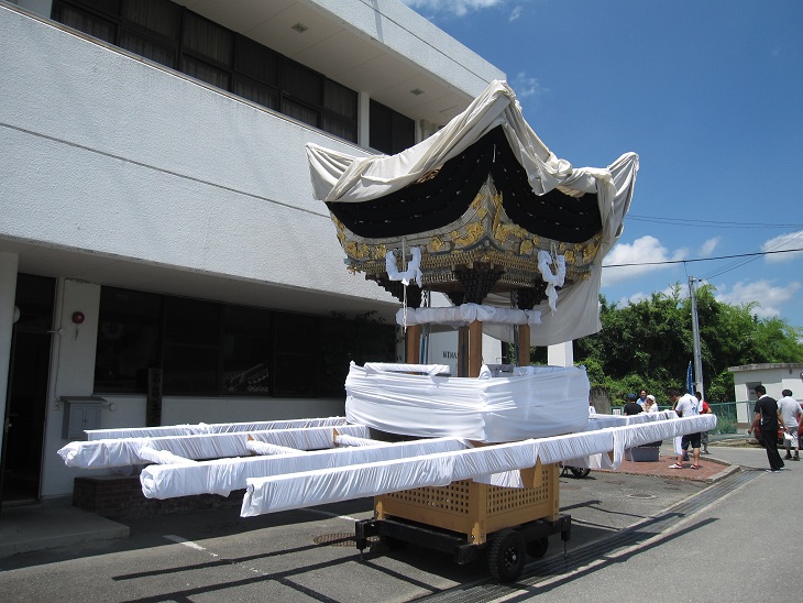 今年は蜂の邪魔も入ることなく、 子供屋台の準備も順調でした。 明日は天気が悪いとか。 濡れないように養生して、 今日はここまでです。 後は太鼓を入れるだけです。 |