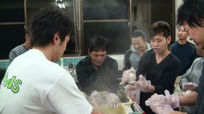 本宮の朝、恒例のおむすび作りを、 消防がお手伝い。 昨年の反省からか、5時半前にして ほぼ消防団勢揃い。 (昨年も集まるのは早かったですが・・・) まだ眠そうですが、 がんばって美味しいのを作ってください。 |