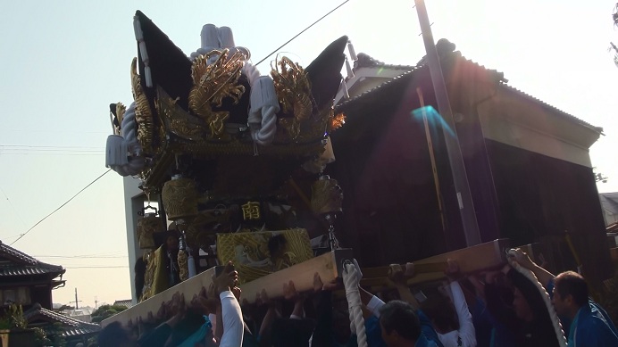 南山田バス停にて西山田屋台の差し上げ。 漆が塗られて間もない棟や 梅鉢に朝日が反射して輝き、 とても綺麗でした。 ただ金具が増えた分、 相当重くなったのでしょうか。 南から10人程助っ人が入っていましたが、 いつもより大変そうでした。 |