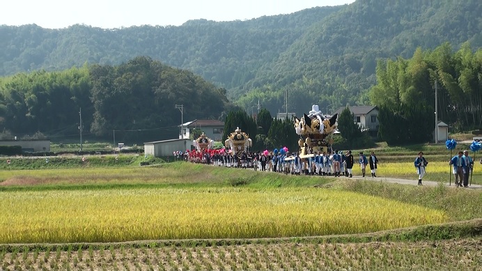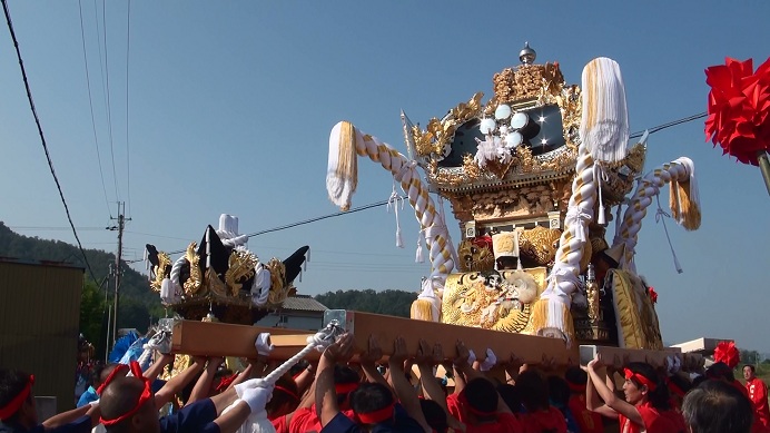 西山田公会堂前で、西山田の幟。 だけと思いきや今年は牧野も 幟を準備していました。 二本の幟の周りを4ヶ村の担ぎ手や 乗り子が取り囲んで盛り上げました。 |