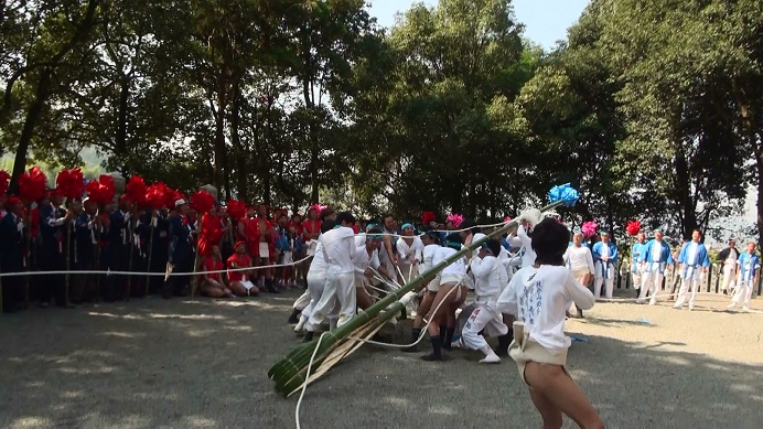 南山田公民館前に戻り、 休憩の後、蔵入れ前に竹割り。 練習では少し心配しましたが、 会長もなんとか上まで登りきりましたね。 でも唄いながら登るのって、 かえって難しいのでは? 明日は神社で頑張ってください。 |