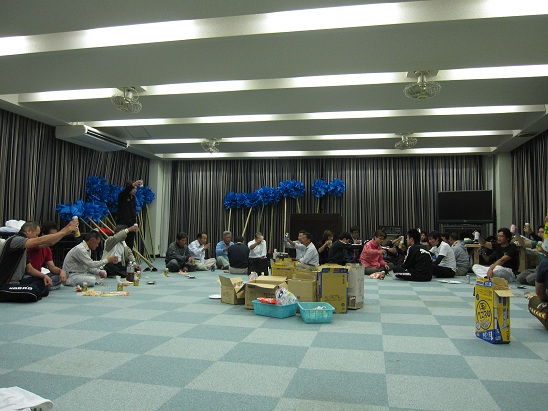 肩合せの後は、 自治会・保存会・消防団と 拍子木・棒綱の懇親会。 本番に向けて、打合せも出来たでしょうか? |