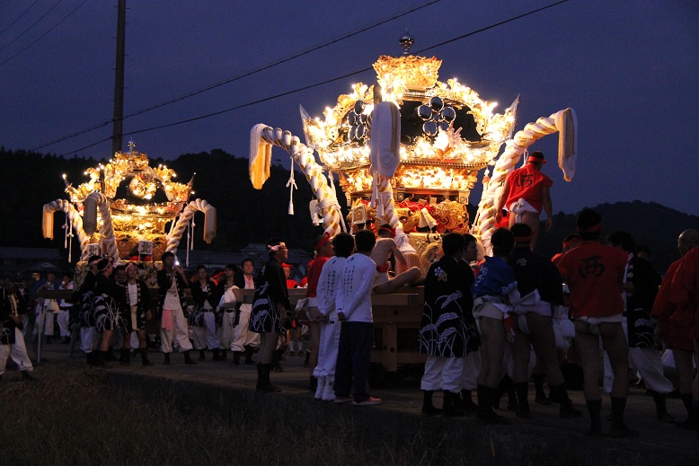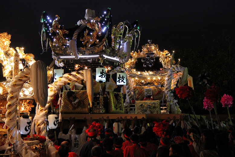 西山田屋台は漆塗りが完成し 昇金具や水切金具も取り付けられました。 それに合わせて3年ぶりに電飾も 取り付けられました。 南山田屋台も移動して、 3台並んでくれると良かったんですが、 あいにく県道の向かいに止まったまま。 とりあえず北と西だけ撮影。 |