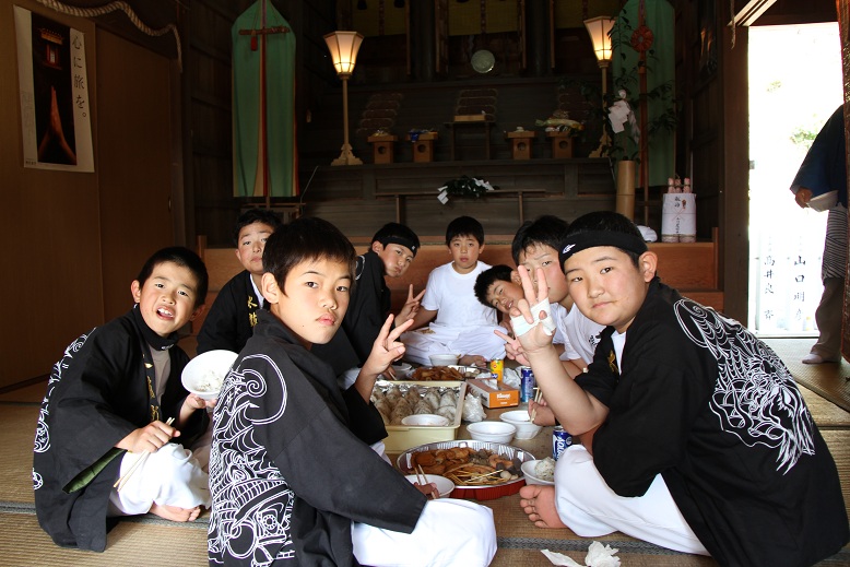 今年も乗り子達の昼食中にお邪魔して記念撮影です。 食べながら・・・なんで、 なかなか全員の顔を収めるのは難しいです。 ピースサインで顔が隠れたり・・・ |
